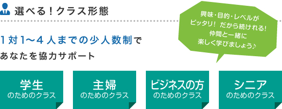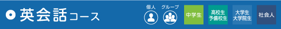 レギュラーコースは、3名までの少人数で、楽しく精鋭特訓。「全く初心者の方でも約3年で上級者に」を目標としています。「読」「聞」「書」「話」の4技能を重視し、正しい英語が最も効率よく学べ、使えるようになります。時間的な効率、費用対効果を考慮し、「安価にして高品質」という自信と、毎回ごとの「確実な上達」と「楽しさ」を満足させた内容を提供しています。中学生・高校生・大学生・社会人、それぞれの興味・目的・レベルに合ったコースが受講できます。